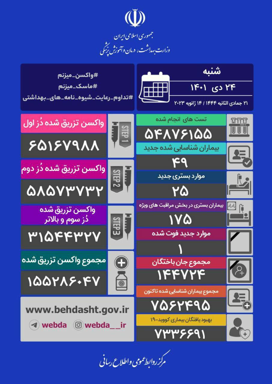 آخرین آمار کرونا در ایران، ۲۴ دی ۱۴۰۱: فوت ۱ نفر در شبانه روز گذشته / شناسایی ۴۹ بیمار جدید کرونایی