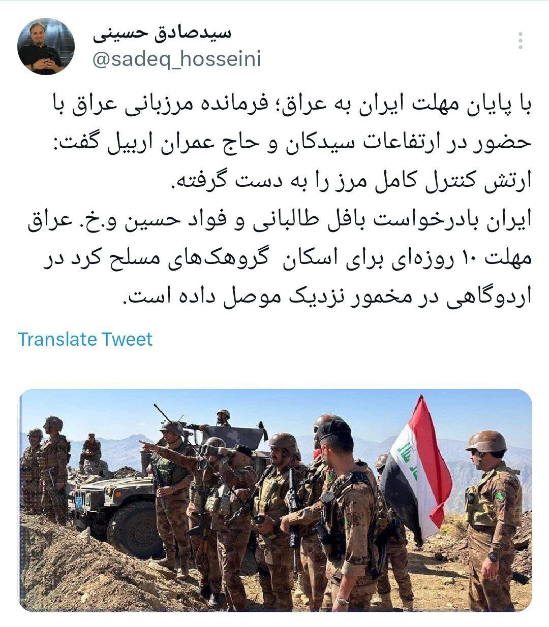🔹با پایان مهلت ایران به عراق؛ فرمانده مرزبانی عراق با حضور در ارتفاعات سیدکان و حاج عمران اربیل گفت: ارتش کنترل کامل مرز را به دست گرفته.
