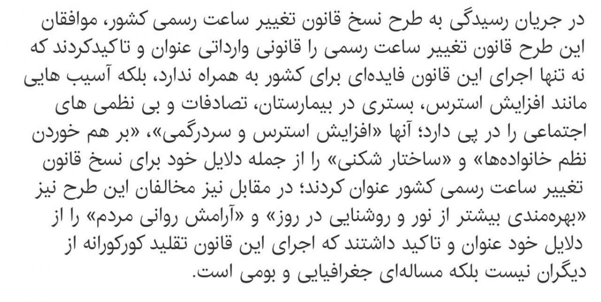 آذری جهرمی، وزیر پیشین ارتباطات در کانال تلگرامی خود نوشت:به جای توجیه معدود افرادی که تغییر ساعت رسمی را یک «قانون وارداتی» میدانستند، قانونی تصویب و یک ملت را سردرگم کردند. اکنون به دنبال توجیه ملت هستند.