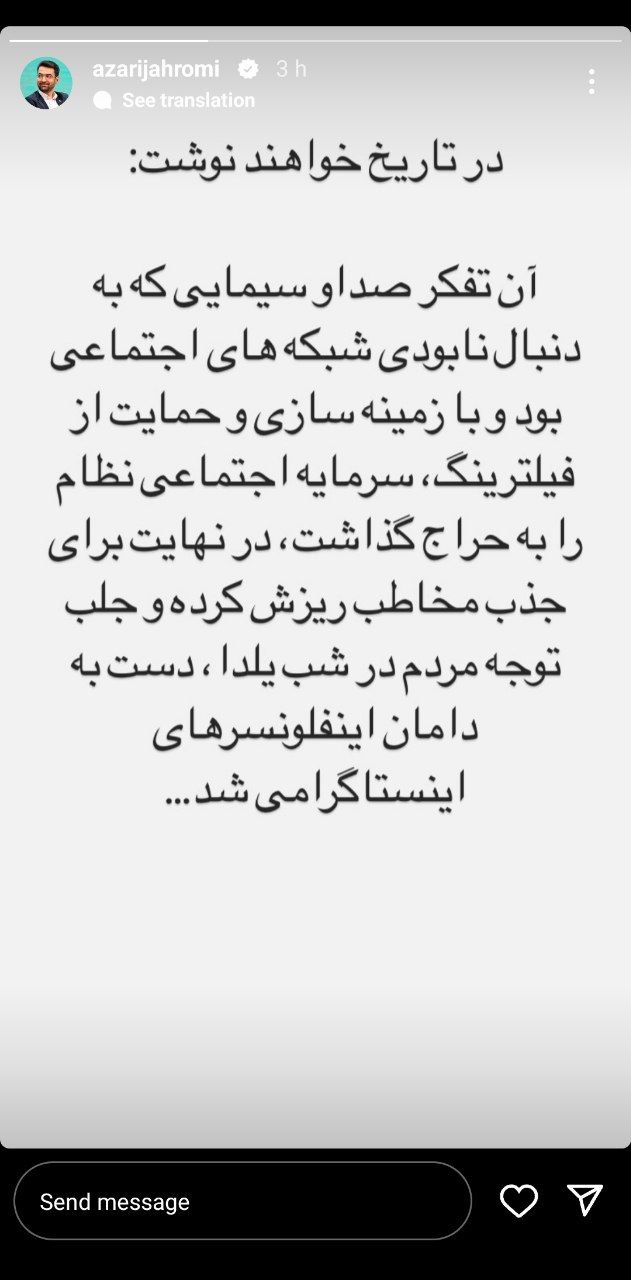 آذری جهرمی: در تاریخ خواهند نوشت صداوسیمایی که سرمایه اجتماعی نظام را با حمایت و زمینه سازی فیلترینگ به حراج گذاشت برای جذب مخاطب دست به دامن اینفلوئنسرهای اینستاگرامی شد.