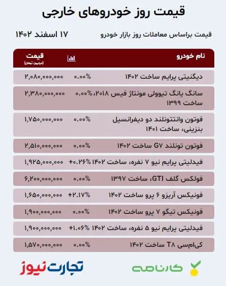 🔹قیمت خودرو، امروز، پنجشنبه، ۱۷ اسفند ۱۴۰۲، تحت تأثیر شرایط بازار ارز امروز باثبات ماند و نوسان چندانی نداشت.