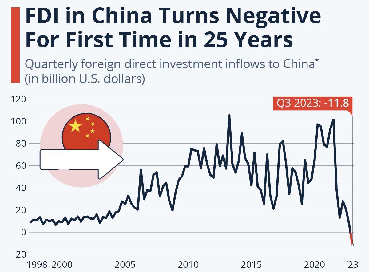 🔹نرخ سرمایهگذاری مستقیم خارجی در چین برای اولین بار منفی شده و حتی چین هم میداند بدون سرمایه گذاری خارجی و بویژه آمریکاییها، رشد اقتصادش متوقف میشود.