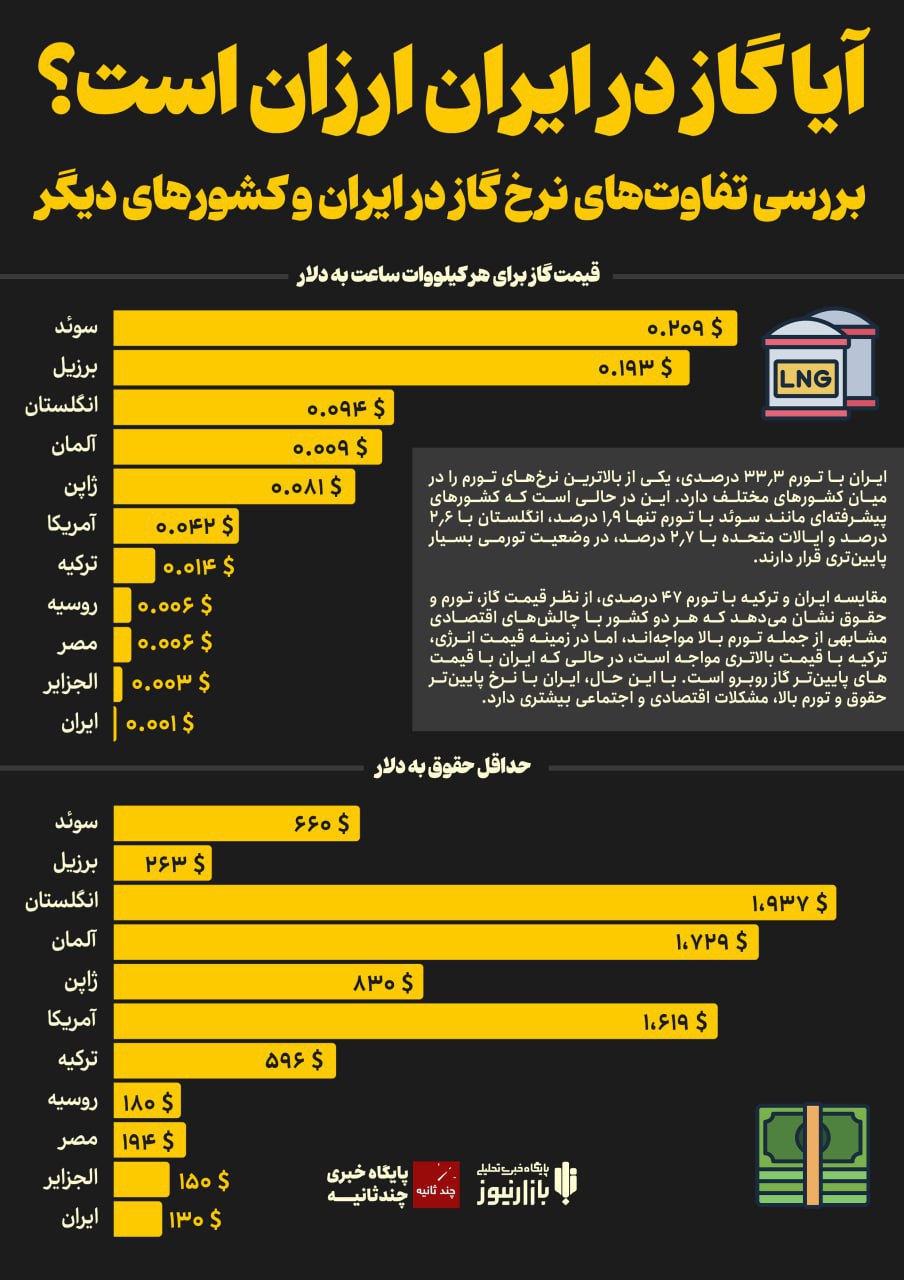 🔹بین قیمت گاز، نرخ تورم، و حداقل حقوق در کشورهای مختلف همبستگیهایی وجود دارد، اما این همبستگیها به شدت تحت تأثیر سیاستهای اقتصادی و شرایط کلان اقتصادی قرار دارند. در کشورهای با قیمت گاز پایین، ممکن است تورم و حقوق پایینتر نیز مشاهده شود، در حالی که در کشورهای با قیمت گاز بالاتر، معمولاً تورم پایینتر است، اما حقوقهای بالاتر هم متناسب با آن وجود دارد. در مورد ایران، نرخ بالای تورم و پایین بودن حقوق به وضوح یک همبستگی منفی با قیمت گاز ارزان این کشور دارد. این وضعیت نشاندهنده مشکلات اقتصادی پیچیده و نیاز به اصلاحات در سیاستهای اقتصادی، انرژی و مالی است.