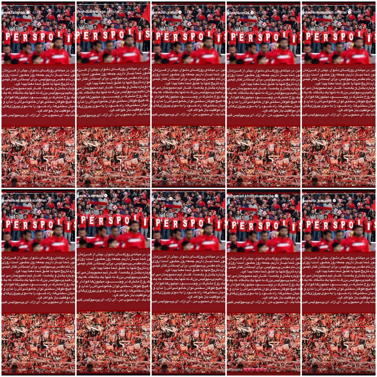 متن منتشرشده که نخستینبار توسط افشین پیروانی، مدیر تیم پرسپولیس، منتشر شد، اکنون به شکل هماهنگ در استوری همه بازیکنان از جمله امید عالیشاه، علی علیپور، محمد عمری، محمدحسین کنعانیزادگان، پیام نیازمند و سایر اعضای تیم بازنشر شده است.