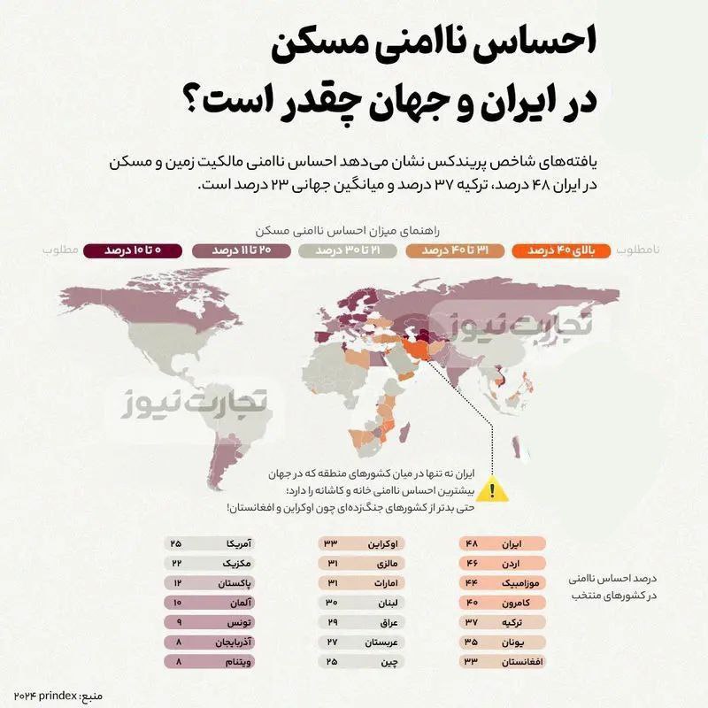 🔹یافتههای شاخص پریندکس نشان میدهد احساس ناامنی مالکیت زمین و مسکن در ایران ۴۸ درصد، ترکیه ۳۷ درصد و میانگین جهانی ۲۳ درصد است.