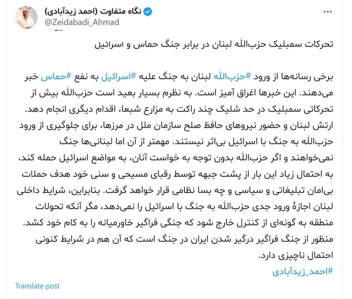 احمد زیدآبادی تحلیلگر سیاسی: حزب الله تنها در صورتی وارد جنگ می شود که درگیری ها به ایران کشیده شود