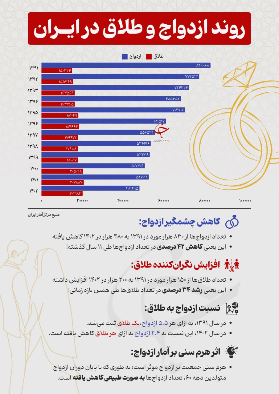 🔹در سال ۱۳۹۱، به ازای هر ۵.۵ ازدواج، یک طلاق ثبت میشد، اما در سال ۱۴۰۲ این نسبت به ۲.۴ ازدواج در برابر هر طلاق کاهش یافته است.