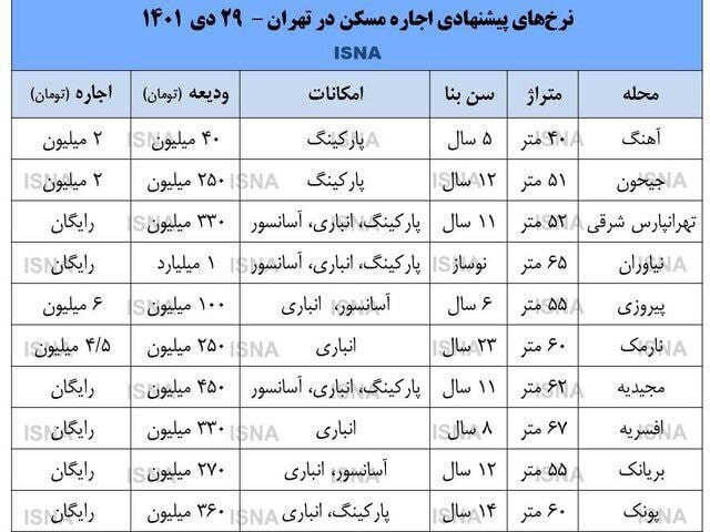🔹آذرماه ۱۴۰۱ اجاره بها در تهران افزایش ۴۱.۳ درصدی را در مقایسه با مدت مشابه سال قبل نشان داد. نرخ رشد ماهیانه اجاره خانه نیز در پایتخت طی ماههای آبان و آذر به ترتیب ۴.۱ درصد و ۲.۵ درصد بود. هنوز آمار دی ماه ارایه نشده اما بررسیهای میدانی نشان میدهد که افزایش قابل توجهی در نرخ اجاره رخ نداده است.