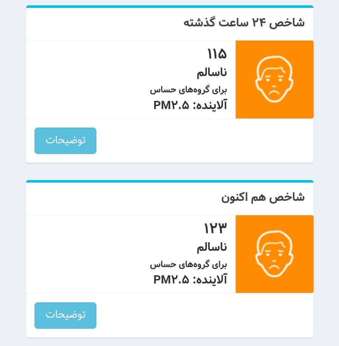 🔹بنابر اعلام شرکت کنترل کیفیت هوای تهران، شاخص آلودگی هوای پایتخت هماکنون روی عدد ۱۲۳ قرار دارد و کیفیت هوا در وضعیت نارنجی و ناسالم برای گروه حساس است.
