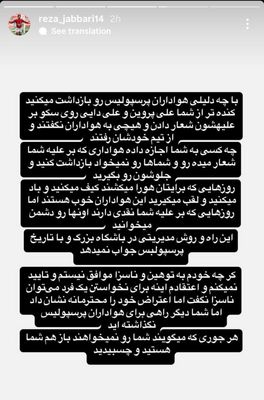 رضا جباری، پیشکسوت پرسپولیس در واکنش به بازداشت چند هوادار پرسپولیس با انتشار یک استوری تند و تیز به رضا درویش حمله کرد