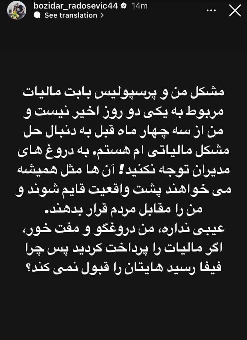 🔹 «مشکل من و پرسپولیس بابت مالیات مربوط به یکی دو روز اخیر نیست و من از ۳-۴ ماه قبل به دنبال حل مشکل مالیاتیام هستم.»
