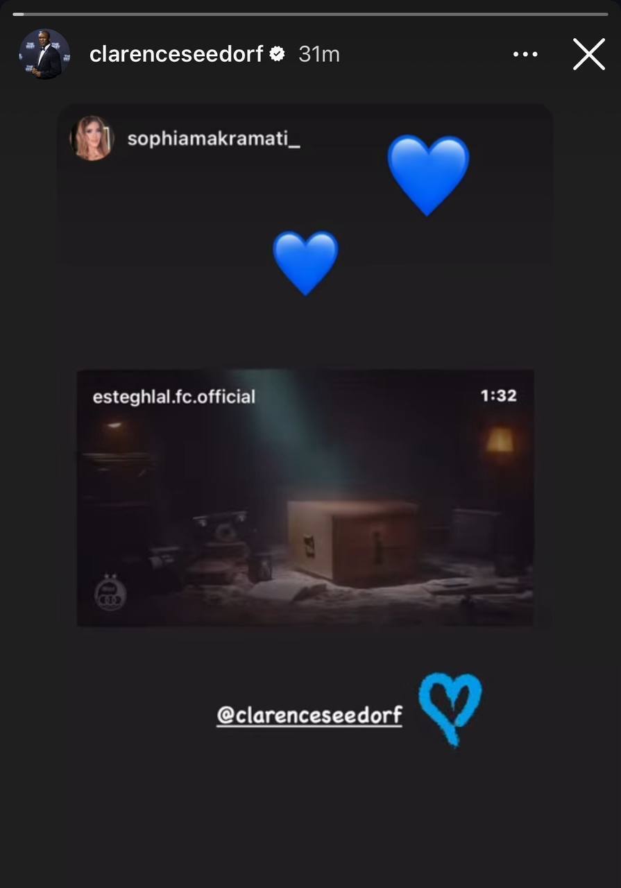 دقایقی پیش، اما در نهایت سیدورف واکنش نشان داد و استوری همسرش از ویدیویی که استقلال برای او تدارک دیده را با قلبهای آبی بازنشر کرد تا برای اولین بار نسبت به این قضیه واکنش نشان داده باشد.