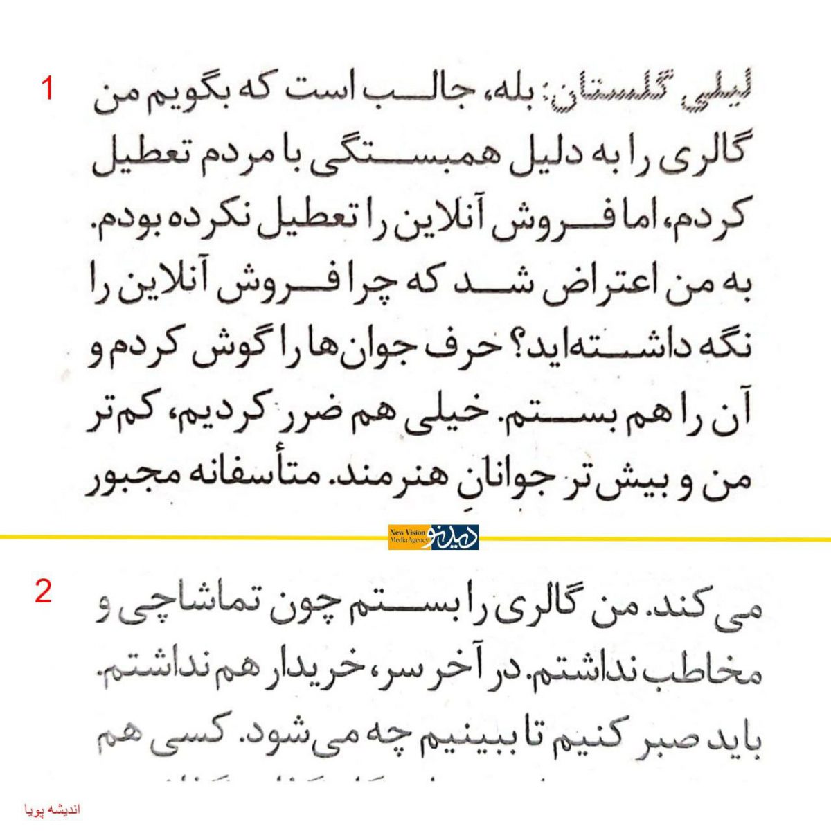 🔹لیلی گلستان مادر مانی حقیقی در گفتگوی جدید خود ابتدا دلیل تعطیلی گالریاش را «همبستگی با مردم» اعلام کرده اما در اواسط گفتگو میگوید «گالری را بستم چون تماشاچی و خریدار نداشتم»