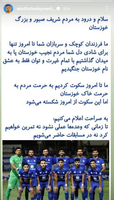 اما با ادامهدار شدن شرایط عدم پرداخت مطالبات بازیکنان و محقق نشدن وعده مدیرعامل باشگاه استقلال خوزستان که پیش از این عنوان کرده بود تا روز یکشنبه ۱۱ آبان تلاش میکنیم بخشی از قرارداد بازیکنان پرداخت شود این بار بازیکنان گلهمند از شرایط موجود در استوریهای جداگانه و به صورت متنی مشترک در صفحه شخصی خود در اینستاگرام تاکید کردهاند تا وقتی که مطالباتشان پرداخت نشود نه تنها تمرین نخواهند کرد، بلکه در هیچ مسابقهای حاضر نخواهند شد.