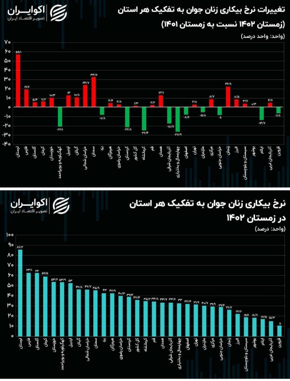 🔹 نرخ بیکاری زنان ۱۵ تا ۲۴ ساله کل کشور در زمستان ۱۴۰۲ نسبت به بازه زمانی مشابه در سال قبل بیشتر شده است./