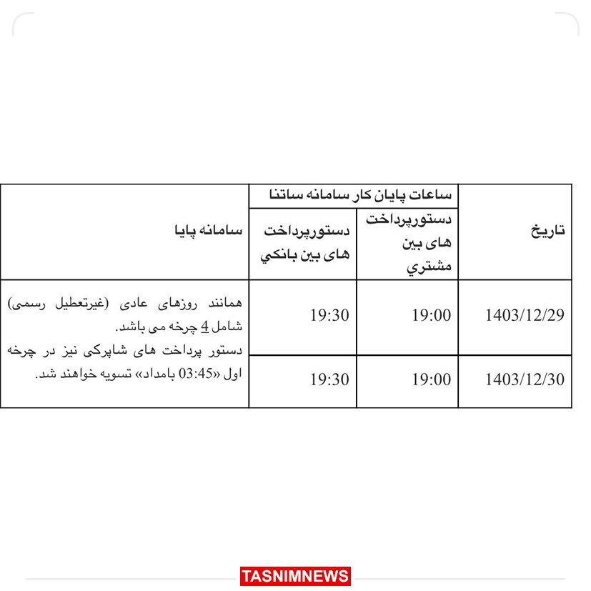 به منظور ایجاد سهولت پرداختهای مشتریان شبکه بانکی در ایام پایانی سال جاری زمانبندی ساعات کاری سامانههای ساتنا و پايا در روزهای ۲۹ و ۳۰ اسفندماه اعلام شد.