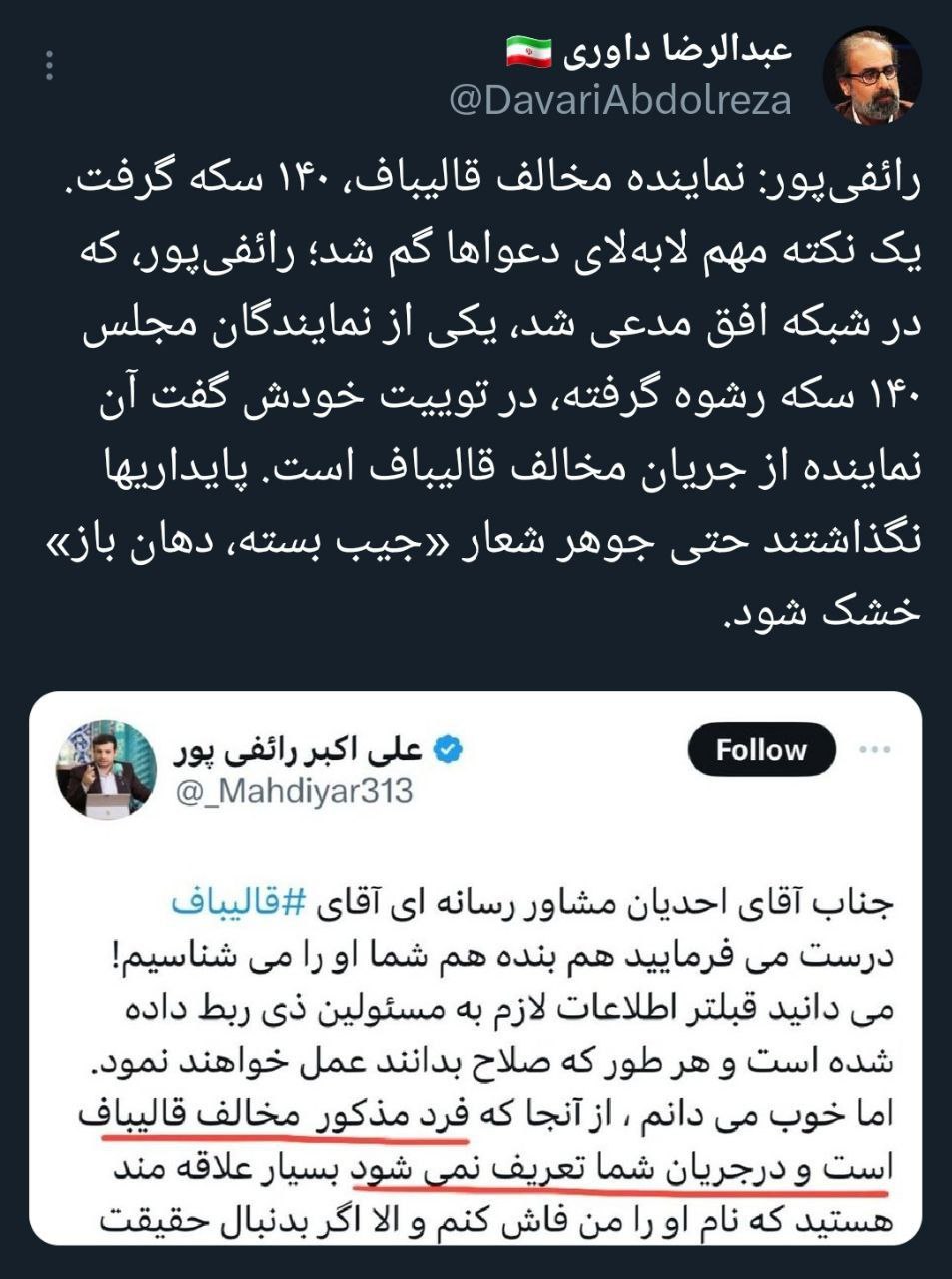 🔹رائفیپور: نماینده مخالف قالیباف ۱۴۰ سکه گرفت. یک نکته مهم لابهلای دعواها گم شد؛ رائفیپور، که در شبکه افق مدعی شد، یکی از نمایندگان مجلس ۱۴۰ سکه رشوه گرفته، در توییت خودش گفت آن نماینده از جریان مخالف قالیباف است. پایداریها نگذاشتند حتی جوهر شعار «جیب بسته، دهان باز» خشک شود.