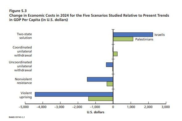 🔹براساس گزارش اندیشکده رَند در سال ٢٠١۵، براساس پنج سناریو در ده سال، پرضررترین حالت منازعه فلسطین و اسرائیل، وضعیت کنونی یعنی جنگ خشونتبار است که ضرر چهار برابری اسرائیل را در پی دارد.