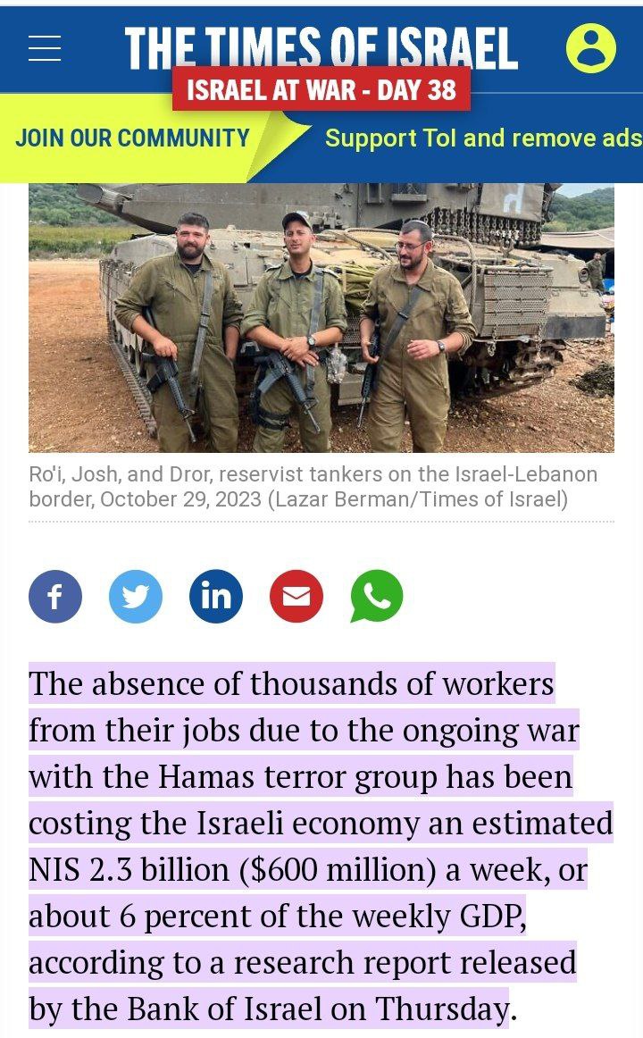 🔹بانک مرکزی اسرائیل در گزارشی که به تازگی منتشر کرده است، هزینه هفتگی کاهش عرضه نیروی کار در سه هفته اول جنگ را تحلیل کرده و خبر داده است غیبت هزاران کارگر به دلیل فراخوان نیروهای ذخیره در هفته ۶۰۰ میلیون دلار برای اقتصاد اسرائیل هزینه داشته است.