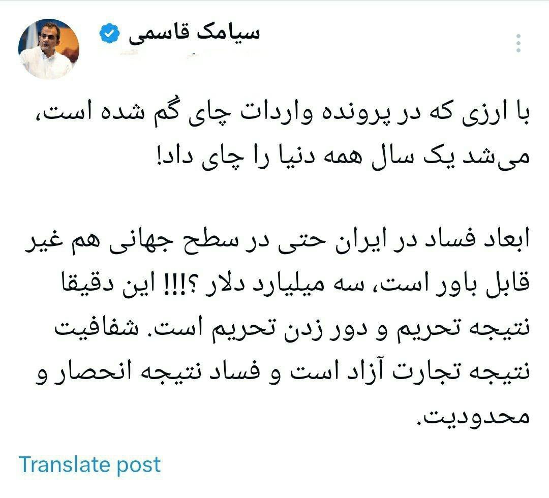 سیامک قاسمی: ابعاد فساد در ایران حتی در سطح جهانی هم غیر قابل باور است، سه میلیارد دلار ؟!!! این دقیقا نتیجه تحریم و دور زدن تحریم است. شفافیت نتیجه تجارت آزاد است و فساد نتیجه انحصار و محدودیت.