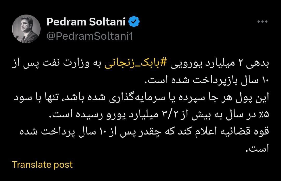 بدهی ۲ میلیارد یورویی بابک زنجانی با سود ۵ درصد میشود طی ۱۰ سال میشود ۳.۲ میلیارد یورو؛ چقدر از این پول برگردانده شد!؟