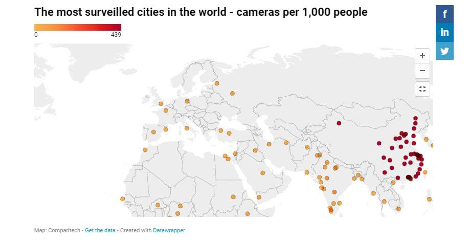 🔹در حالی که شهرهای چین با ۴۳۹ دوربین به ازای هر هزار نفر در صدر دهگان در رتبههای نخست قرار دارند، رقم تهران نیم تخمین زده شده، ۹ میلیون و ۵۰۰ هزار نفر جمعیت و پنج هزار دوربین مداربسته. همین رقم برای مشهد، یک دهم است.