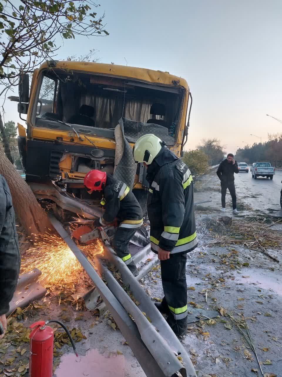 برخورد کامیون با گاردریل و ۹ درخت حاشیه بزرگراه شهید اردستانی در اصفهان/علت: خواب آلودگی راننده