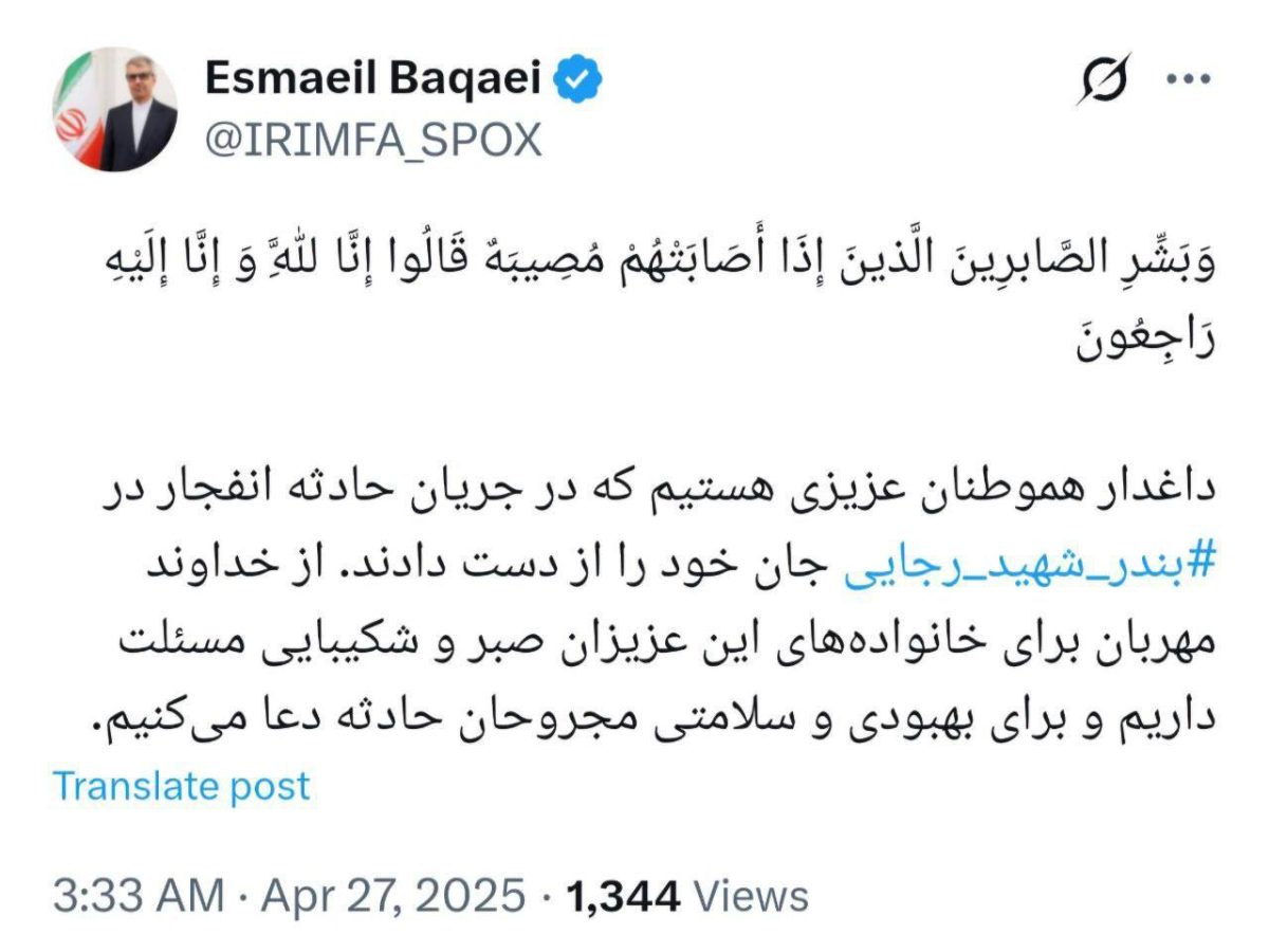 سخنگوی وزارت امور خارجه در واکنش به حادثه انفجار بندر شهید رجایی در شبکه ایکس نوشت: وَبَشِّرِ الصَّابرِینَ الَّذینَ إِذَا أَصَابَتْهُمْ مُصِیبَهٌ قَالُوا إِنَّا لِلَّهِ وَ إِنَّا إِلَیْهِ رَاجِعُونَ