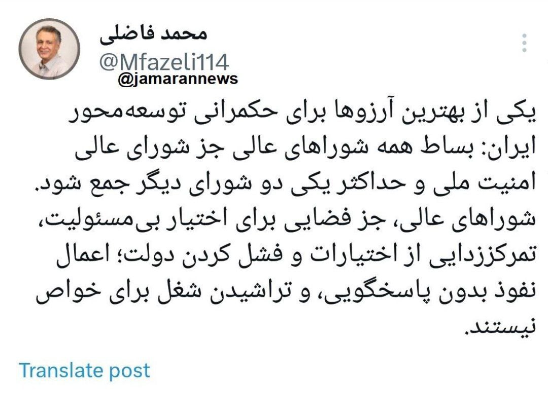 یکی از بهترین آرزوها برای حکمرانی توسعهمحور ایران: بساط همه شوراهای عالی جز شورای عالی امنیت ملی و حداکثر یکی دو شورای دیگر جمع شود. شوراهای عالی، جز فضایی برای اختیار بیمسئولیت، تمرکززدایی از اختیارات و فشل کردن دولت؛ اعمال نفوذ بدون پاسخگویی، و تراشیدن شغل برای خواص نیستند.