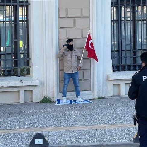 به گزارش راشاتودی، در ازمیر ترکیه مردی بر روی پرچم اسرائیل ایستاد و اسلحه را به سرش گذاشت