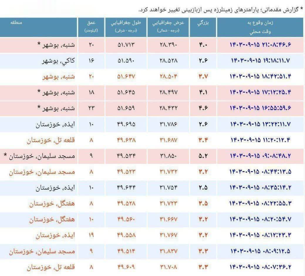 🔹با ثبت آخرین زلزله در شهرستان شنبه، شمار زمین لرزههایی که طی چند ساعت اخیر مناطق مختلف استان بوشهر را لرزاند به ۵ مورد رسید.