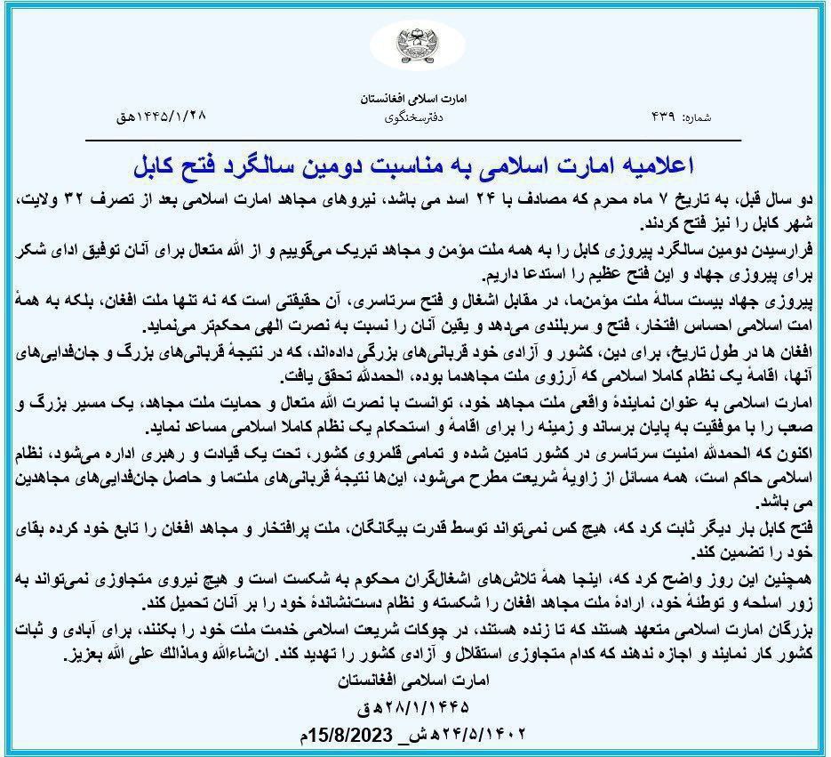بیانیه طالبان (امارات اسلامی افغانستان ) برای دومین سالگرد سقوط کابل و حکومت جمهوری اسلامی افغانستان و بازگشت به قدرت