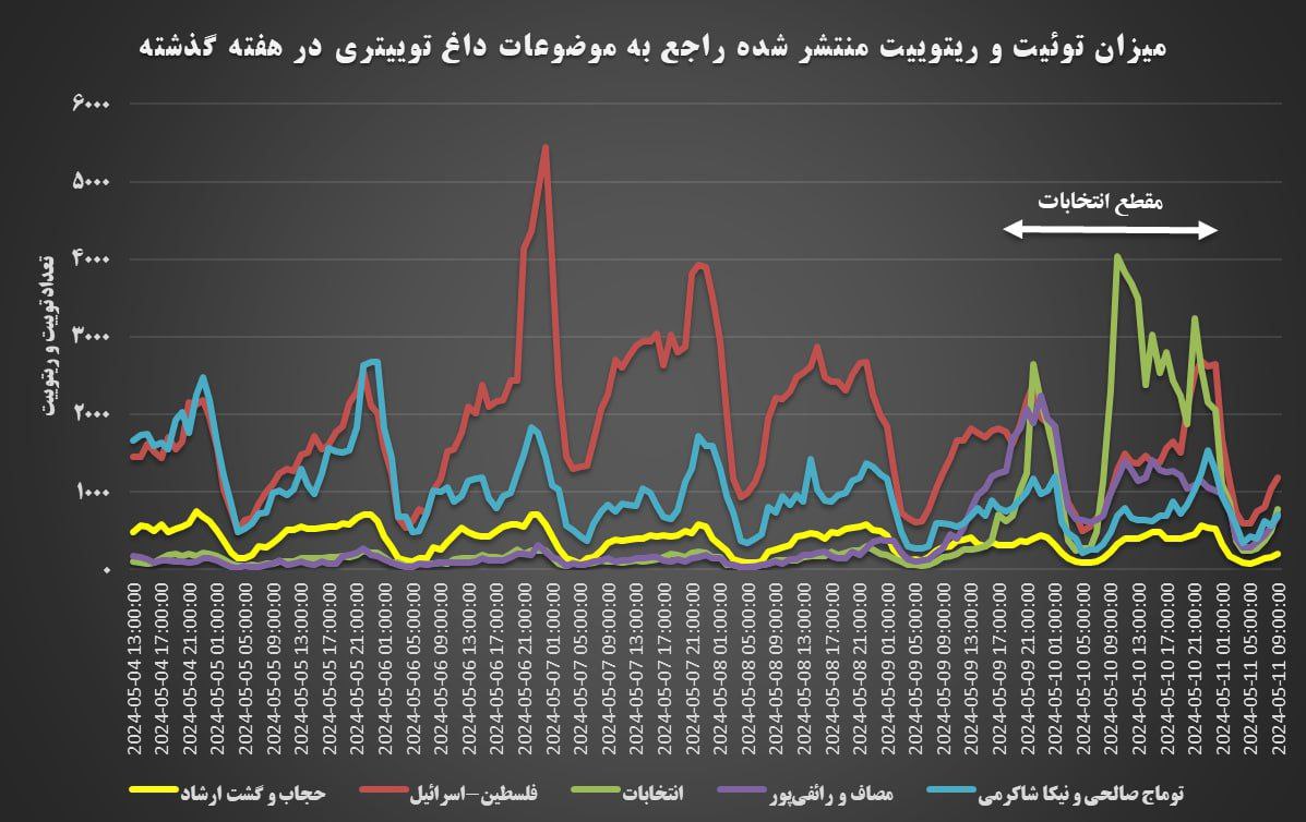 🔹بر اساس این یافتهها، همزمان با حمله اسرائیل به رفح،تعداد توئیتهای مربوط به فلسطین و اسرائیل با اختلاف از هر موضوع دیگری بیشتر مورد توجه کاربران توئیتر در هفته گذشته بوده است./
