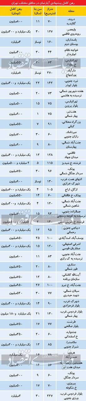 🔹روزنامه دنیای اقتصاد جدول قیمت رهن آپارتمان در مناطق مختلف تهران را منتشر کرده است.