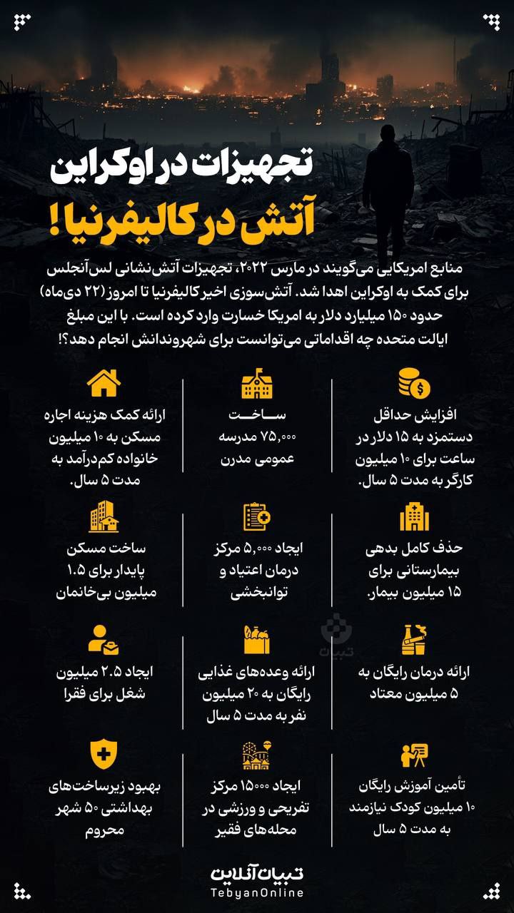 🔹 منابع آمریکایی میگویند در مارس ۲۰۲۲، تجهیزات آتشنشانی لسآنجلس برای کمک به اوکراین اهدا شد. از طرفی آتشسوزی اخیر کالیفرنیا تا امروز (۲۲ دیماه) حدود ۱۵۰ میلیارد دلار به آمریکا خسارت وارد کرده است. با این مبلغ ایالت متحده چه اقداماتی میتوانست برای شهروندانش انجام دهد؟!/تبیان