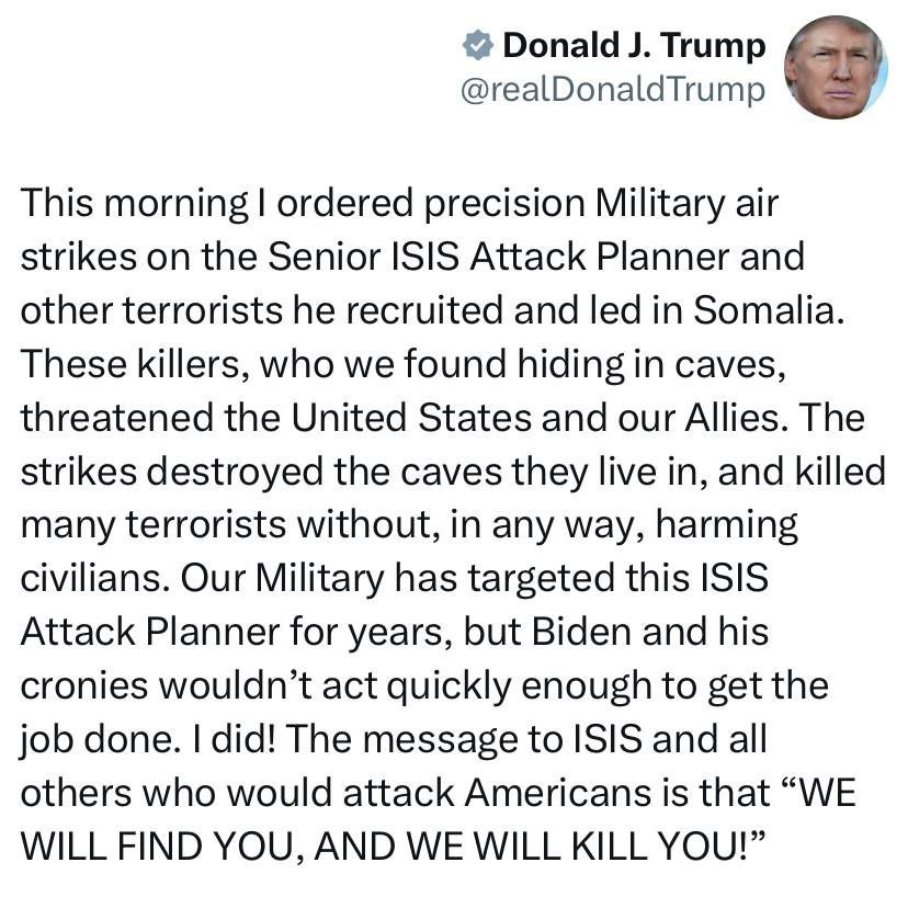 ترامپ: 🔹امروز صبح دستور حملات هوایی دقیق نظامی به طراح ارشد حملات داعش و سایر تروریست هایی که در سومالی جذب و رهبری می کرد را صادر کردم.