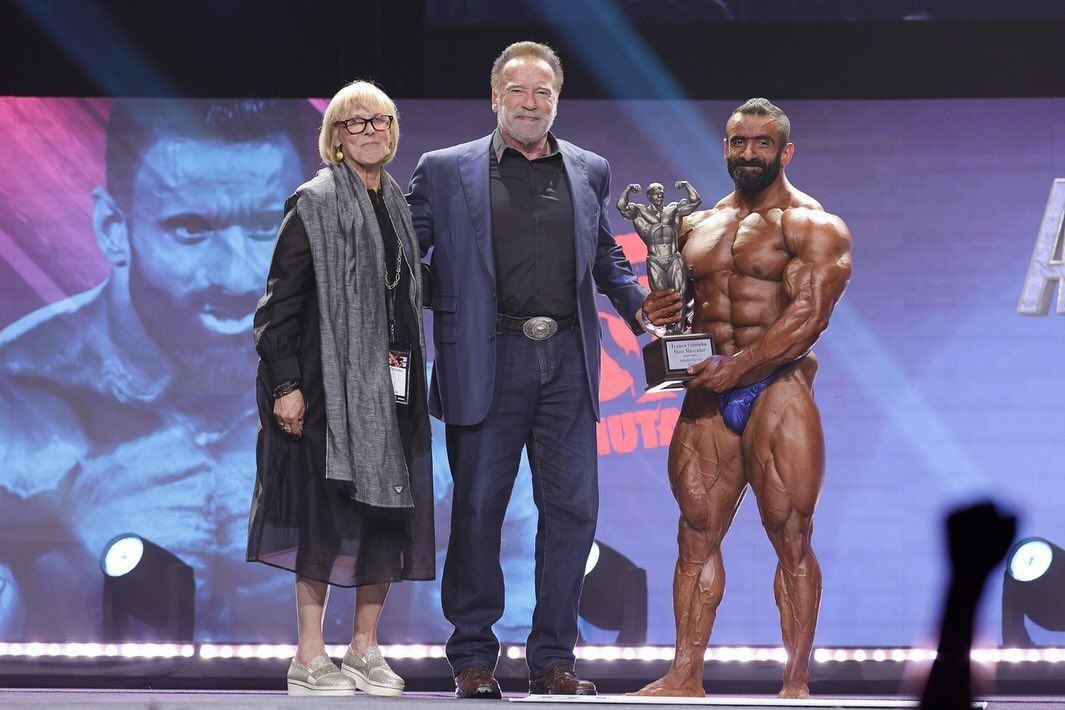 تصاویری از هادی چوپان در کنار آرنولد شوراتزنگر در هنگام اهدای جایزه قهرمان رقابت آرنولد کلاسیک