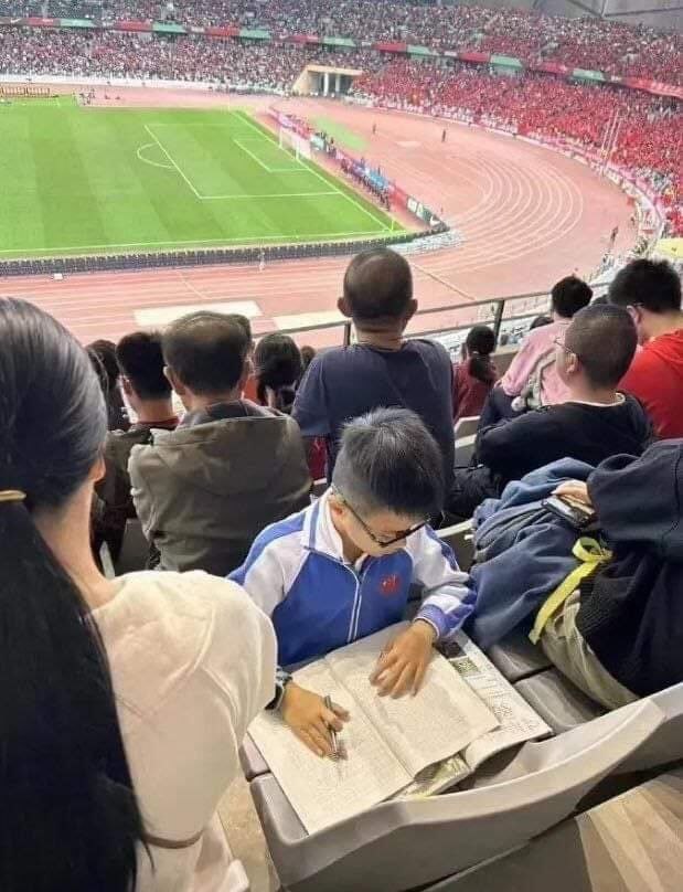 تصویر جالبی از دانش آموز چینی وسط بازی چین و کره جنوبی در حال نوشتن مشق شب!