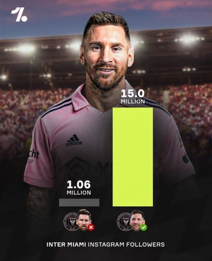تعداد فالوئرهای اینستاگرام باشگاه اینترمیامی قبل و بعد از پیوستن مسی به این تیم
