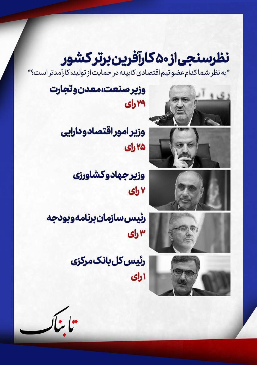🔹حال چطور شده وزیر اقتصاد با رای بالا در این نظرسنجی به مقام دوم رسیده را باید از طراحان این نظرسنجی پرسید.