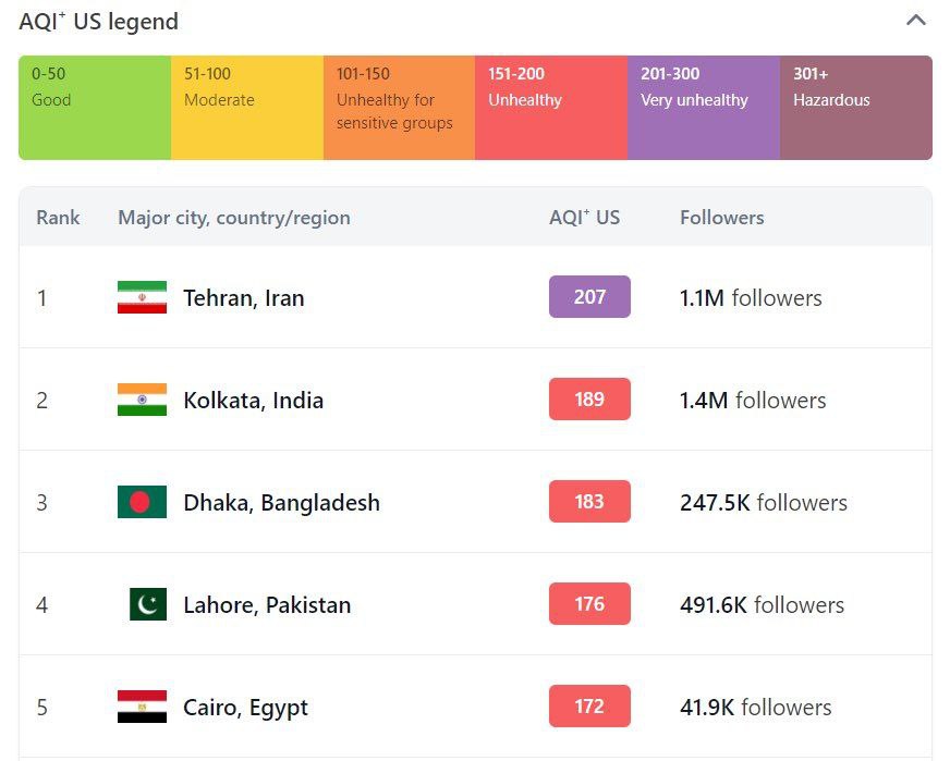 🔹طبق گزارش این شرکت، تهران با شاخص ۲۰۷، صدر جدول آلودگی هوا را در سرتاسر جهان از آن خود کرده است. رتبه دوم، به شهر کلکته در هند اختصاص دارد.