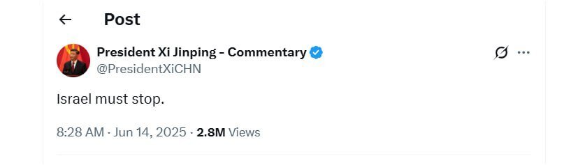 توئیت ۳کلمه ای رئیس جمهور چین درباره حمله اسرائیل به ایران
