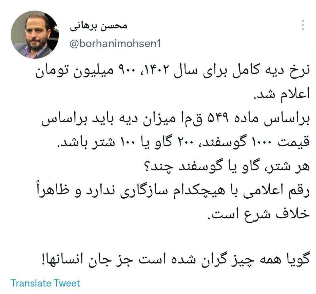 توییت دکتر محسن برهانی حقوق دان و عضو هیات علمی دانشگاه تهران در باره نرخ دیه