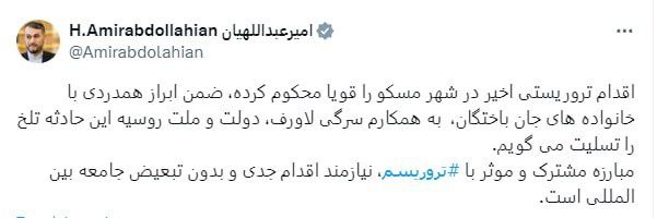 توییت وزیر امور خارجه ایران در خصوص محکومیت حادثه تروریستی در شهر مسکو