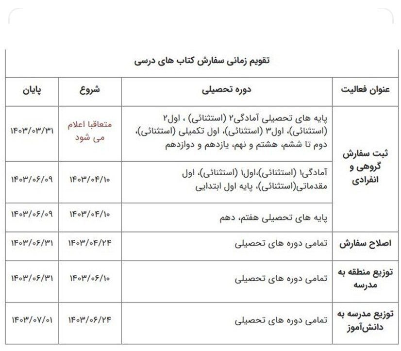 🔹آغاز ثبت سفارش کتابهای درسی به تعویق افتاده است و در سامانه ثبت سفارش کتابهای درسی اعلام شده که تاریخ ثبت سفارش متعاقباً اعلام خواهدشد.