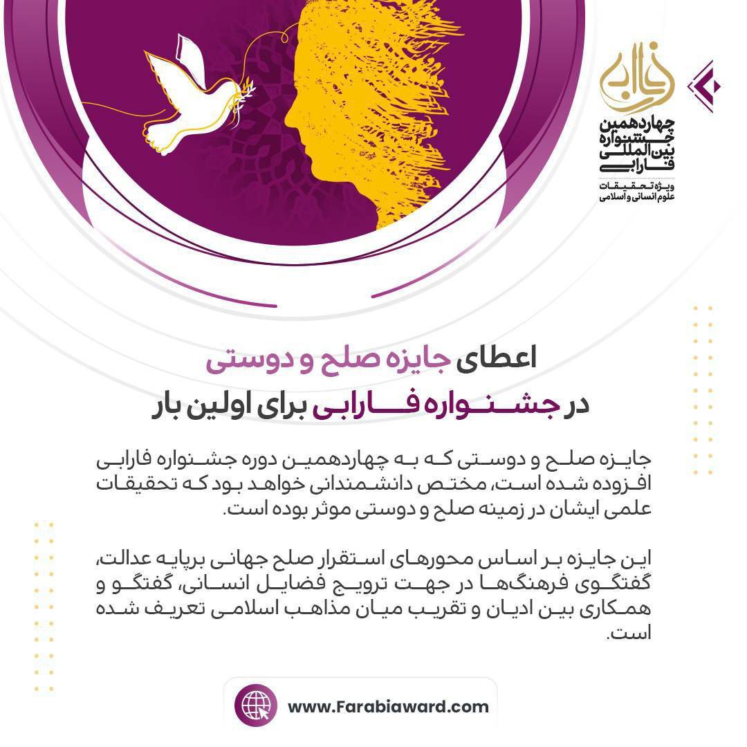 جایزه صلح و دوستی برای اولین بار در چهاردهمین دوره جشنواره بین المللی علوم انسانی فارابی روز دوشنبه ۱۹ تیر با حضور رئیس مجلس اعطا می شود.