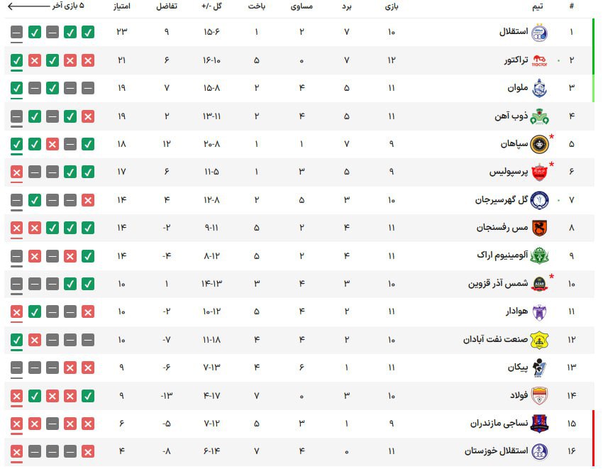 جدول ردهبندی لیگ برتر پس از پایان روز اول از هفته دوازدهم