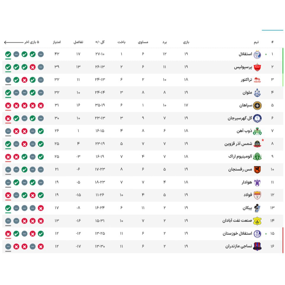 جدول لیگ برتر فوتبال در پایان هفتۀ نوزدهم