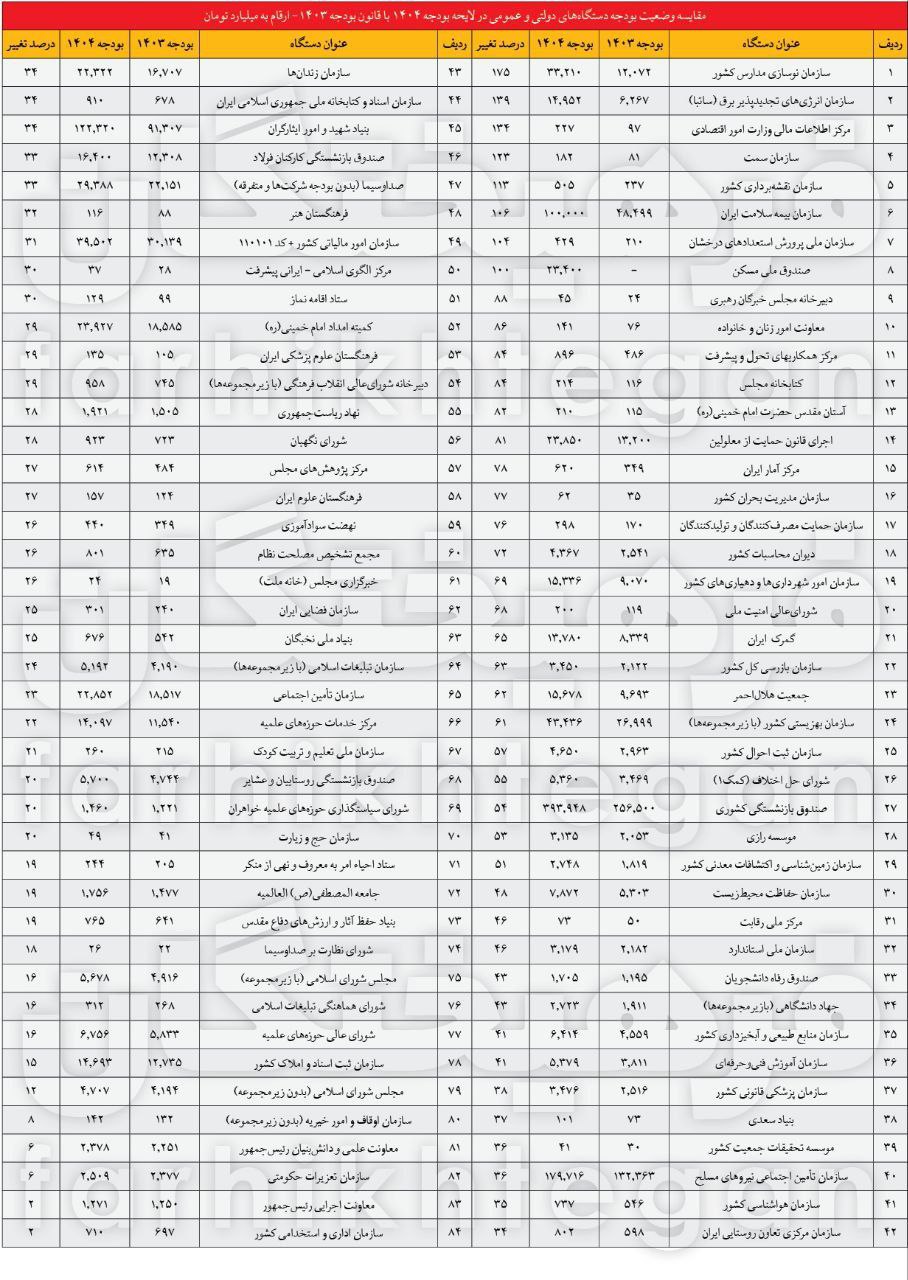 🔹روزنامه فرهیختگان بودجه سال ۱۴۰۴ را با بودجه سال ۱۴۰۳ مقایسه کرده که درصد رشد برخی از آنها به شرح زیر است: