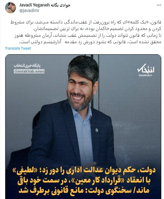 جوادی یگانه، جامعه شناس: 🔹قانون، «یک کلمه»ای که راه برونرفت از عقبماندگی دانسته میشد، برای مشروط کردن و محدود کردن تصمیم حاکمان بوده، نه برای تزیین تصمیماتشان.